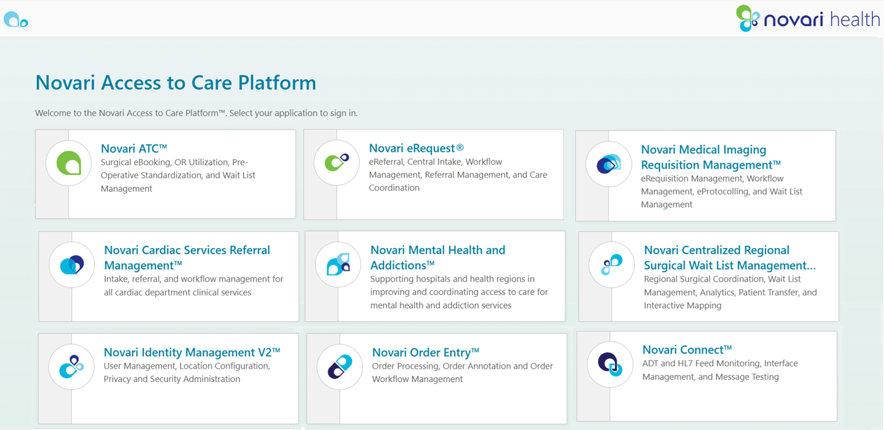 The Novari Access to Care Platform™ landing page presents an easy way to sign into your applications if you organization uses more than one.