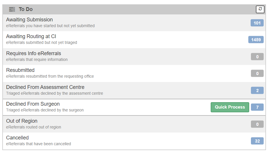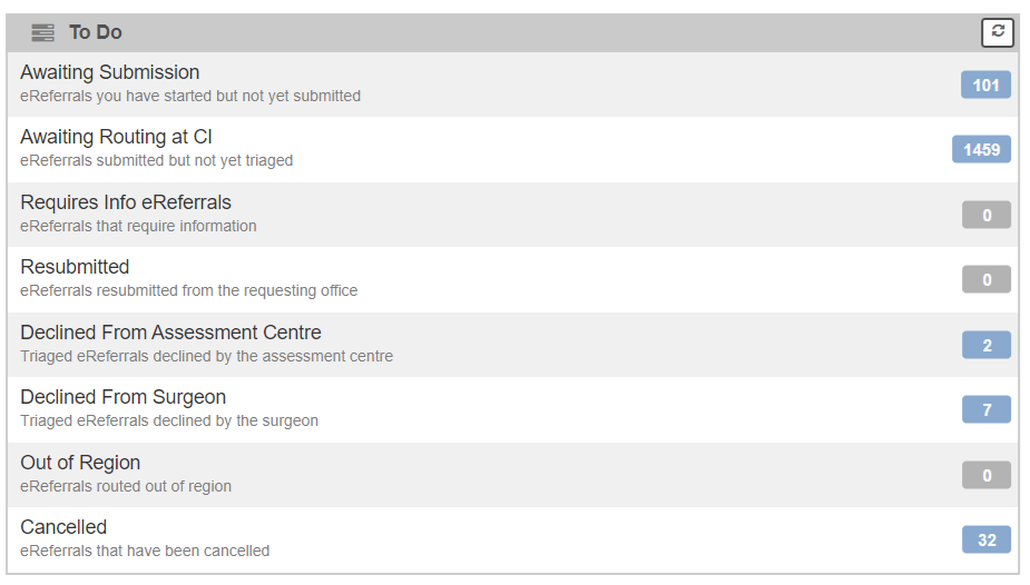 A dashboard is divided into buckets. The buckets are unique to the dashboard and contain all the referrals in that state. For example, all referrals that are waiting to be routed by central intake are in one bucket, all referrals that have been declined by the surgeon are in another. The total number of items in that bucket is displayed.