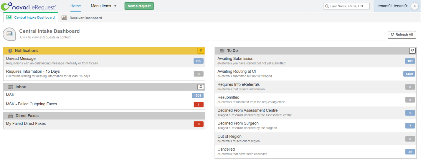 Dashboards are user-specific views that are built to house the referrals that pertain to that user role. Dashboards are built based on the needs of the user role, and can house referrals in multiple states, different modalities, and so on. Dashboards appear as tabs along the top of the Novari eRequest screen. A user may see only one dashboard tab or multiple, depending on the user’s role.