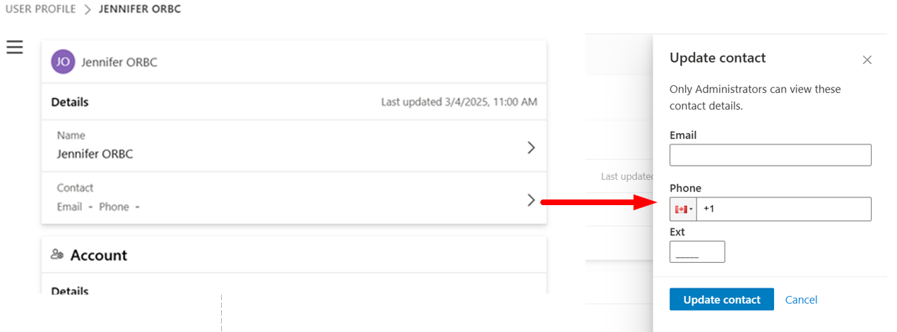Making edits has changed. For editable areas, such as Contact shown below, selecting the right chevron opens a panel where you make the changes. The panel disappears when you have finished making your edits or have cancelled the action.