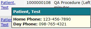 Name | This is the patient’s name in the format Last Name, First Name. Hovering over a patient’s name displays their telephone numbers. Clicking on a patient name navigates to the View Patient page. |