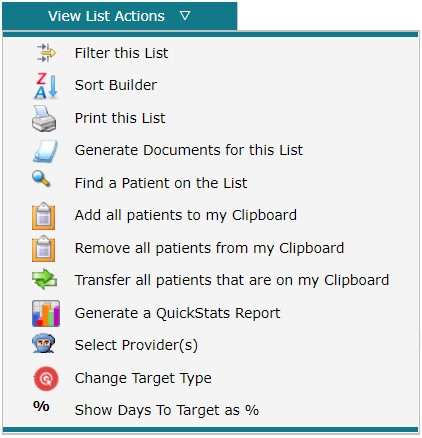 The View List Actions menu on the top left of the View List page are actions that can be applied to the entire list or a subset of the list. Each is explained below.