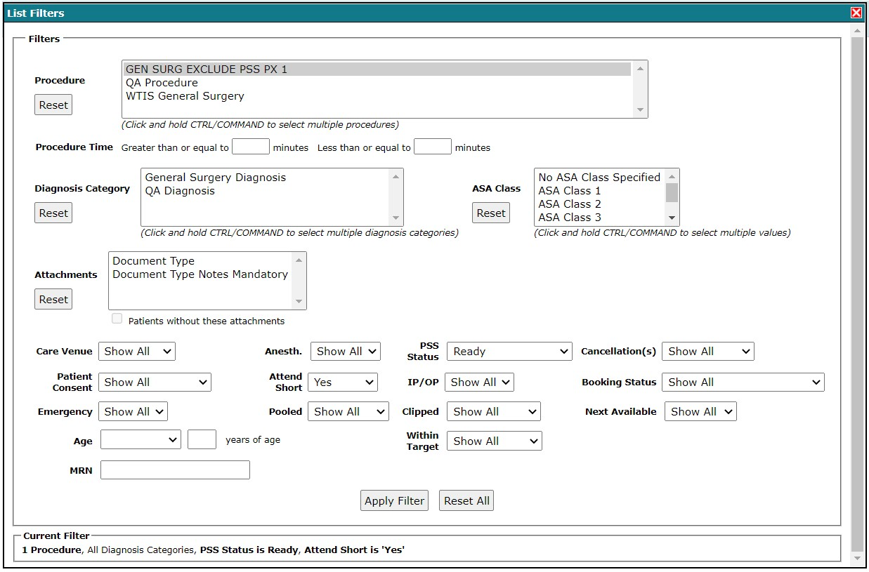 For example, there is an immediate opening for a procedure, and you want to find patients who are ready and are willing to come in on short notice. To find these patients, use the List Filters to select the procedure, then select Ready from the PSS status dropdown, and Yes from the Attend Short dropdown. This will generate a filtered list of patients who are immediately available for that surgical procedure.
