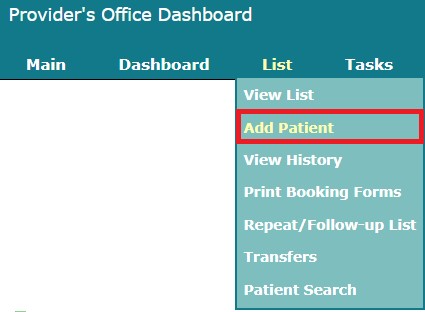 Select List in the Provider’s Office navigation menu, and then select Add Patient.
