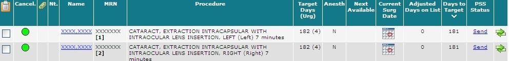 Information about the status of the patient’s case is also displayed. For example, when Current Surg Date and Days to Target are highlighted in red, the patient has missed their target date for their given priority score. Days on List is the number of days the patient has been waiting for their procedure.
