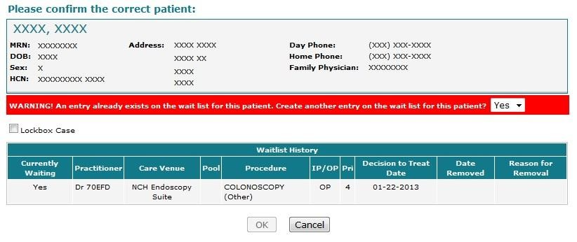 Novari ATC displays a wait list history for the patient, depending on the system settings. If the patient is already on the wait list, the red warning will appear to confirm this patient should still be added to the wait list. If the patient is the correct patient, select OK. The system will then open the Add Patient page. If not correct, select Cancel to re-enter search criteria. If the patient cannot be found after several confirmed correct attempts, add an unregistered patient.