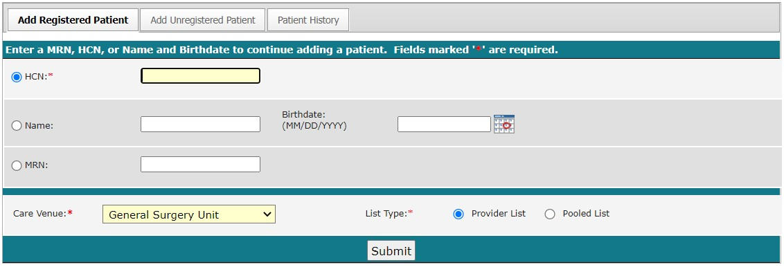 Enter a patient identifier (MRN), a health card number, or both the name and birthdate.