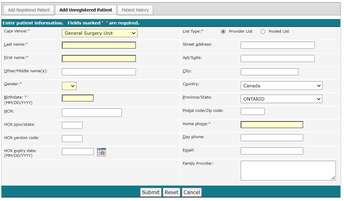 The Add Unregistered Patient tab