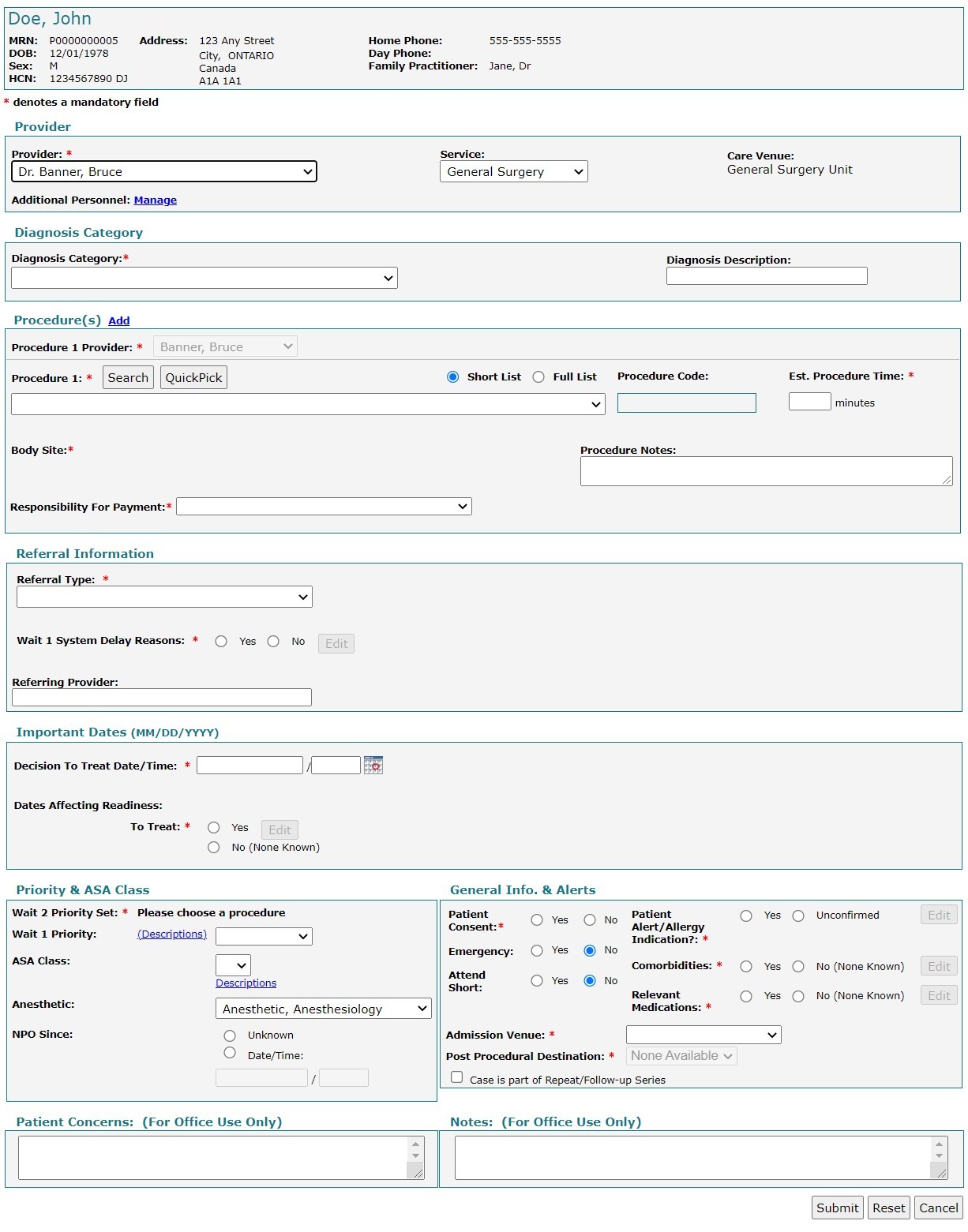 Once information has been entered in all mandatory fields, select Submit and the new wait list entry will be added to your elective surgical procedure wait list. Any relevant booking forms may automatically appear, prompting additional fields to be filled based on the care venue.