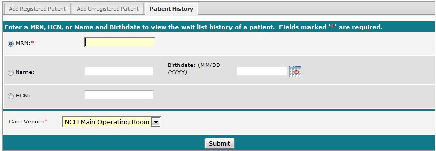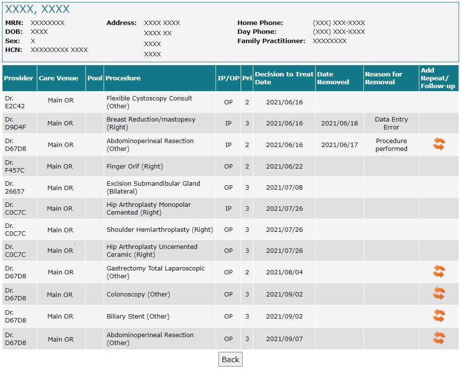 The Wait List History page shows the patient’s demographic information and all procedures the patient has had cancelled, performed, or is waiting for.