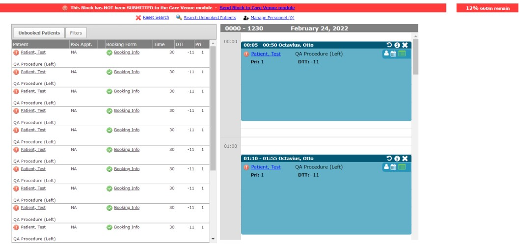 INFO FOR THE BLOCK TO BE SENT TO THE CARE VENUE MODULE. ONCE A BLOCK HAS BEEN SENT TO THE CARE VENUE MODULE, YOU WILL ONLY BE ABLE TO BOOK PATIENTS WITH VALID INFORMATION.