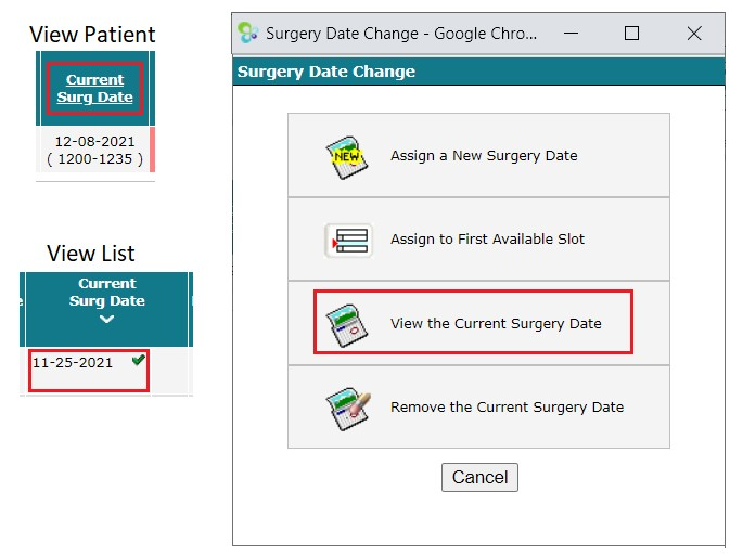 On View Patient page, select Current Surg Date and select View Current Surgery Date in Surgery Date Change.