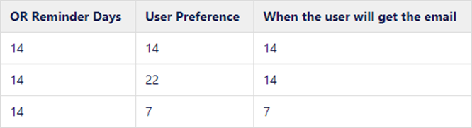 Here is a chart to display when a user will receive email notification based upon OR Reminder Days and User Preference settings: