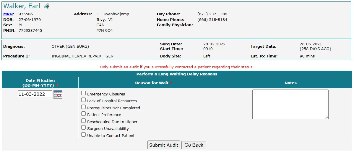 When the general audit task appears in your Dashboard Task List, you should contact the patients regarding their status and complete the general audit. Click on the patient's name to display the general audit page. Once there, you can perform the general audit.