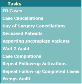 | The tasks in the Task component on the Dashboard do not always match the tasks available from the Tasks menu. For example, the Short Notice Patients task on the Dashboard is not available in the Tasks menu. |