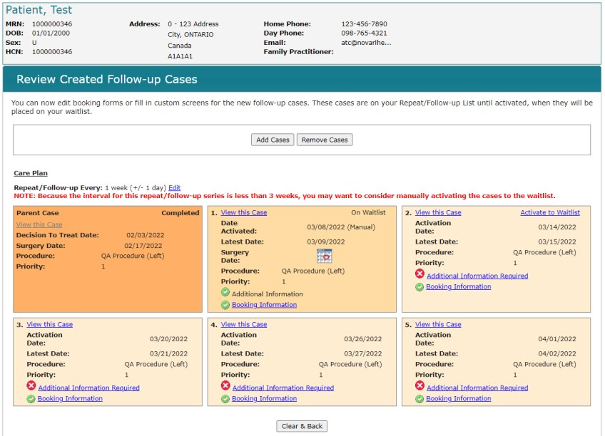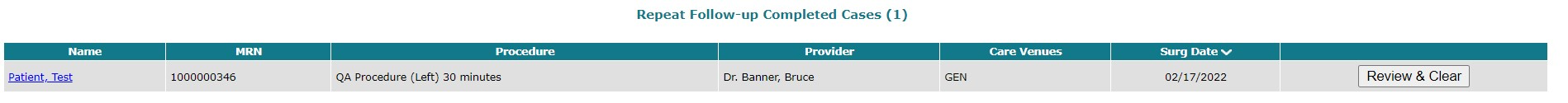 Click Review & Clear to display Edit Repeat/Follow-up. Review the completed case and click Clear & Back to return to the list of completed Repeat Follow-up cases.
