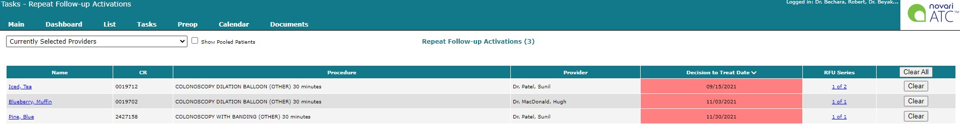 Some of the tasks are initiated by messages sent through the message interfaces between the hospital’s information systems and Novari ATC. For instance, if the OR cancels a patient’s surgical procedure, that message is sent to Novari ATC and appears as a case cancellation. Others, such as Repeat Follow-up Activations and Repeat Follow-up Completed Cases remind you of actions you may need to take such as manually activating a repeat follow-up case to the wait list.