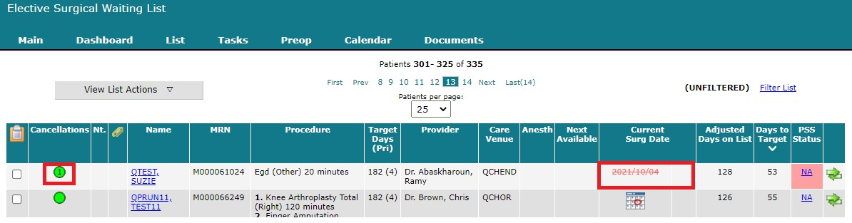 Notice there is no calendar icon for the third entry on the list. This could be because the case has a DART (days affecting readiness to treat) indicating the patient is not available for surgery on the day this page was viewed.