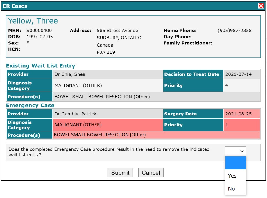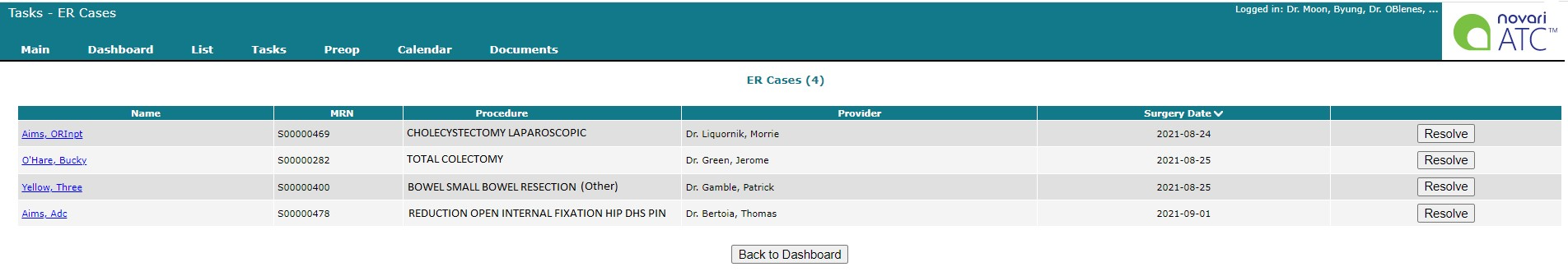 When a message interface exists between Novari ATC and your hospital’s patient information system, the ER Cases list displays patients on your wait list who recently presented in the ER. You need to decide if emergency represents a medical escalation in the patient’s condition, or if the emergency is unrelated, in which case the patient will still require the elective surgery.