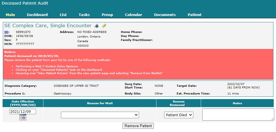 When a message interface exists between Novari ATC and your hospital’s patient information system, the Deceased Patient list displays patients marked as deceased in the hospital’s patient information system. Once a patient has been recorded as deceased in your hospital’s patient information system and removed from your wait list, the patient will no longer be found during patient searches in Novari ATC.