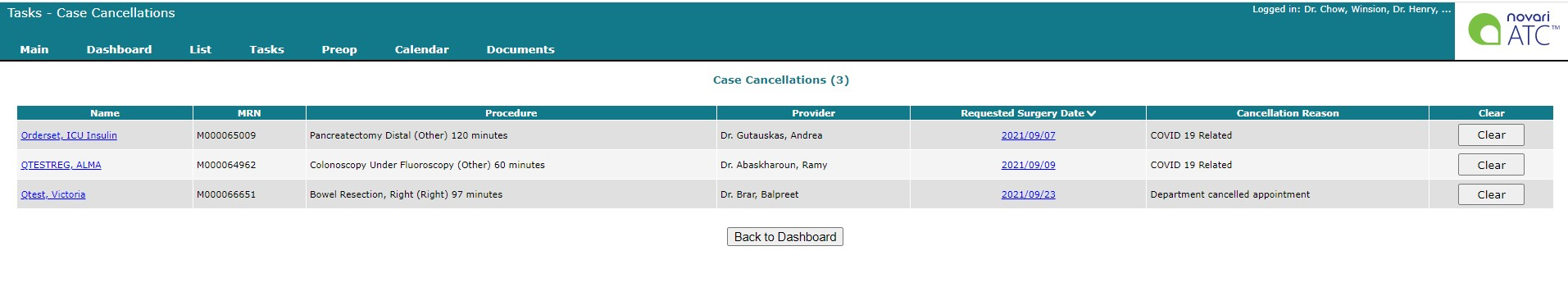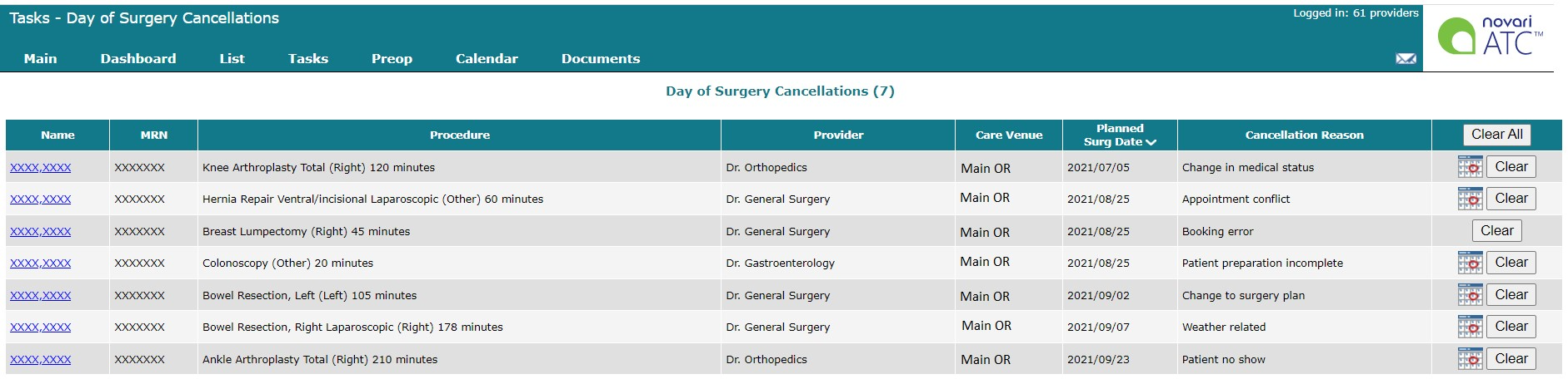 Click Clear to remove the case from the list of day of surgery cancellations.