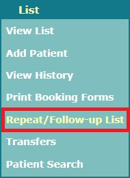 To view a list of Repeat/Follow-up cases, select Repeat/Follow-up List from the List entry of the Provider’s Office navigation menu.