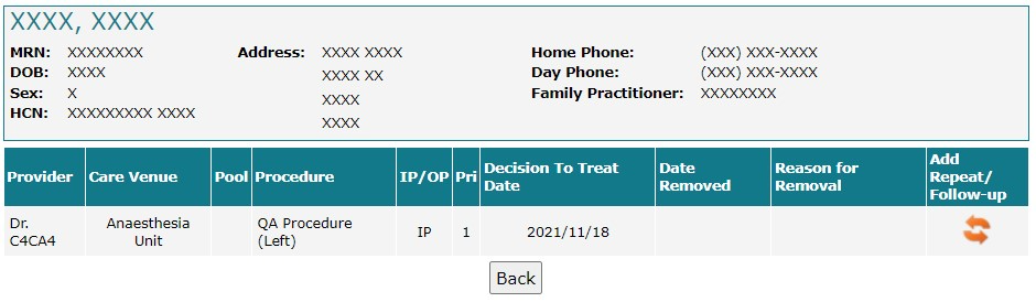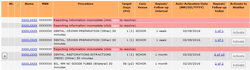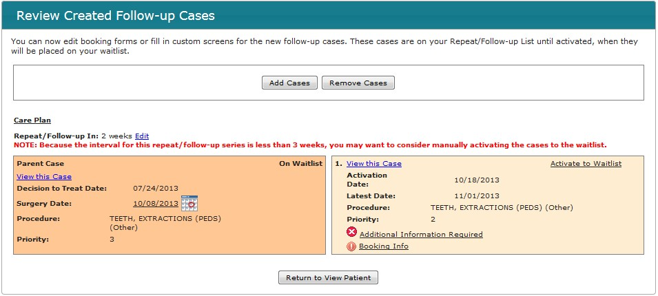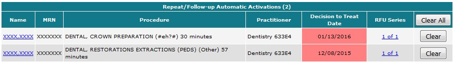 Once the interval has elapsed for a case, the case will be automatically activated and placed onto the wait list. The Repeat/Follow-up Automatic Activations page displays cases that have been automatically activated. The Decision to Treat date will be the day the case was activated.