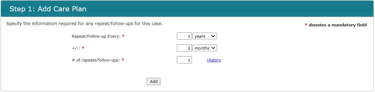 (+/-) indicates a time frame in which it is acceptable to see the patient. For example, entering 2 months would indicate the provider is okay with a Repeat Follow-up every 1 year (+/-) 2 months.