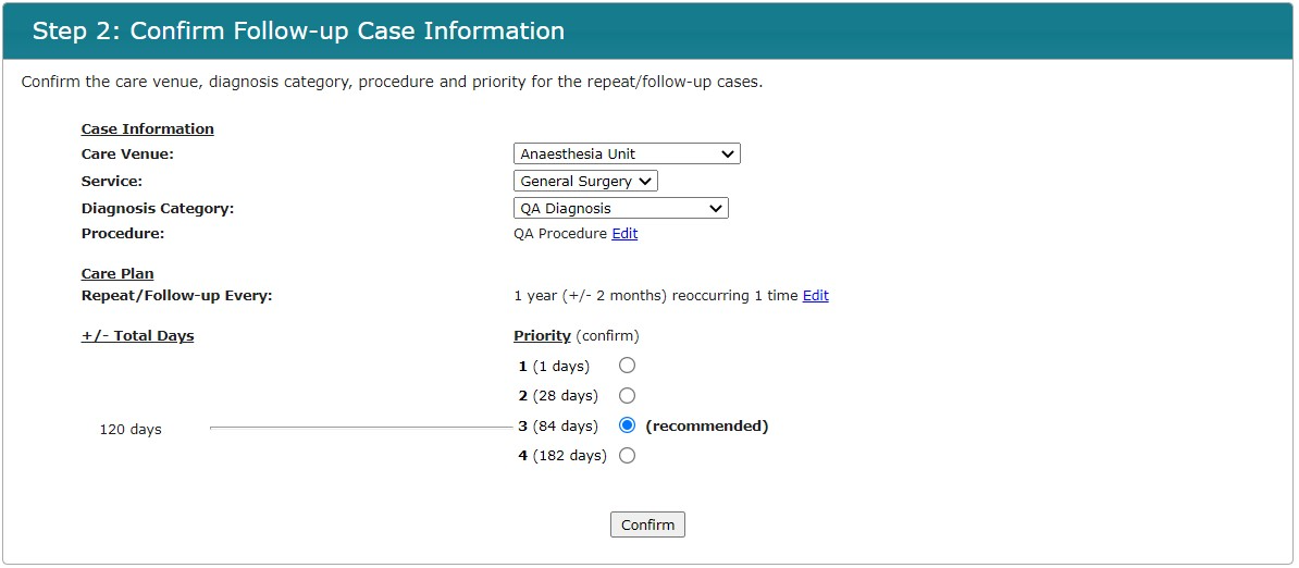 Review the care plan created in Step 1. The procedure and care plan can be edited. For example, the procedure in the Repeat/Follow-up series may be different than the first wait list entry.