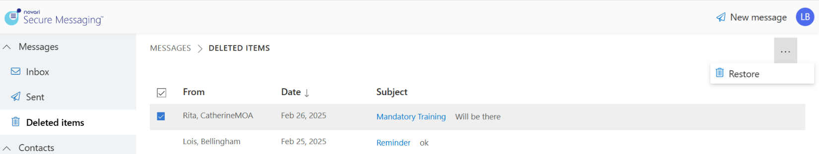 You can restore a message by selecting the message and selecting Restore from the More options menu. It is restored to where it was deleted from, either Inbox or Sent.