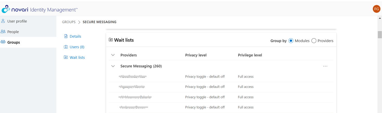 The Novari ATC site administrator enables Secure Messaging for a health center using groups in the Security module or Identity Management module. (You may have one or the other depending on your Novari ATC instance.)