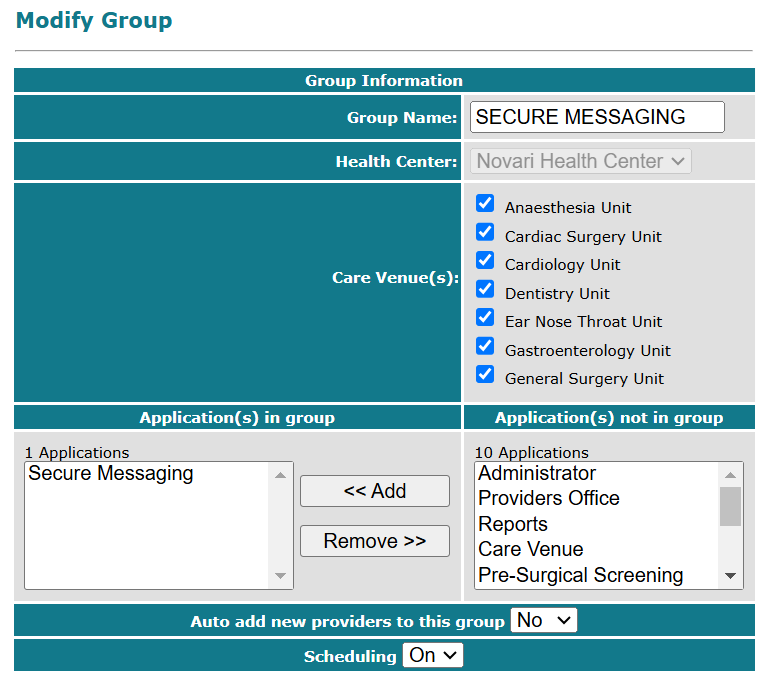 For information about creating and managing groups, please refer to the Security Module guide or Identity Management guide in the Novari Health Resource Centre.