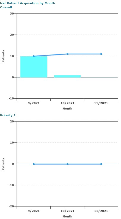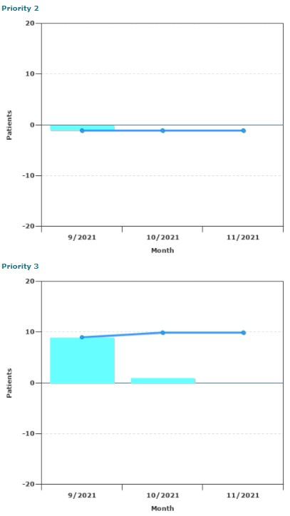 This report illustrates the acquisition of patients, by priority, for a defined period. The report quickly and easily trends whether wait lists are growing or shrinking over time, or for a given month. Qualifiers, in addition to the CSC used to generate the report, are: