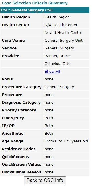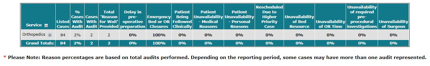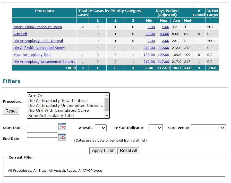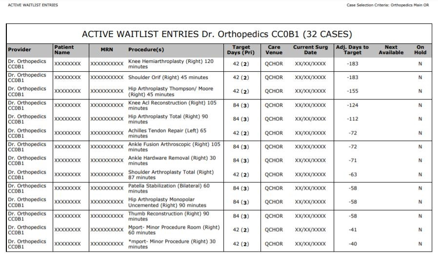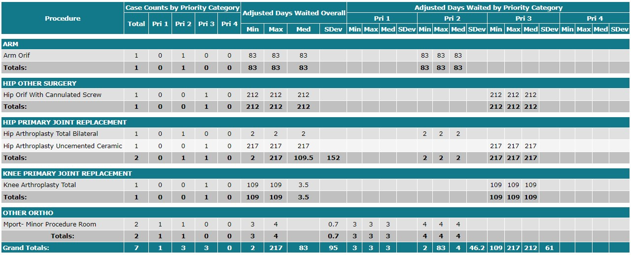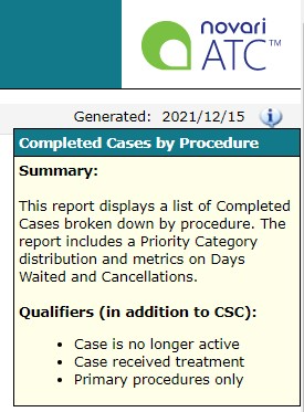 This report displays a list of completed cases broken down by procedure. The report includes a Priority Category distribution and metrics on Days Waited and Cancellations. Qualifiers, in addition to the CSC used to generate the report, are: