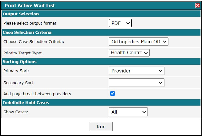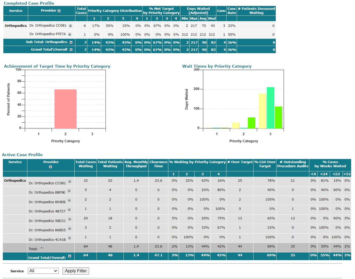 This report displays a list of completed cases broken down by provider. The report includes a priority category distribution and metrics on days waited and cancellations. Qualifiers, in addition to the CSC used to generate the report, are: