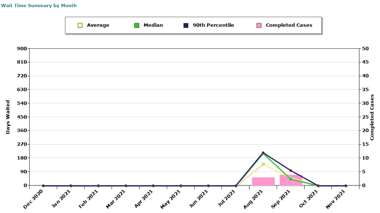 This report displays a column for the count of completed cases in a month. There are three lines which represent the days waited as an average, median, and 90th percentile (the default value which can be changed).