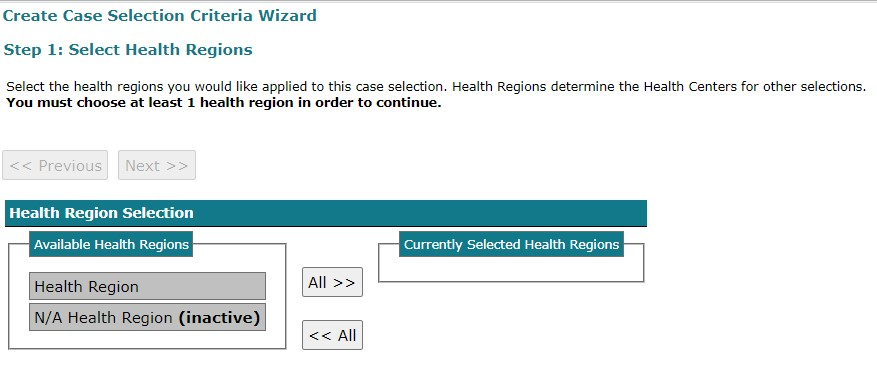 You must select a health region, health center, care venue and service, after which you can choose to continue adding criteria or finish the wizard.