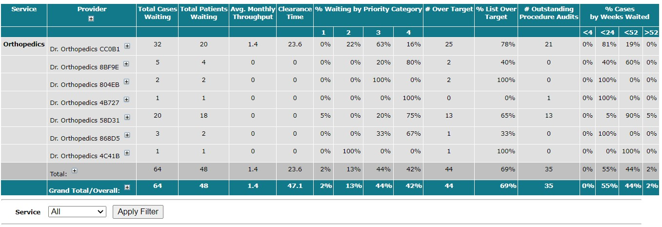 This report gives a summary of cases waiting by provider. It includes metrics for throughput, clearance time, and % waiting by priority category. The report will flag a provider’s list when over 50% of the list is over target.