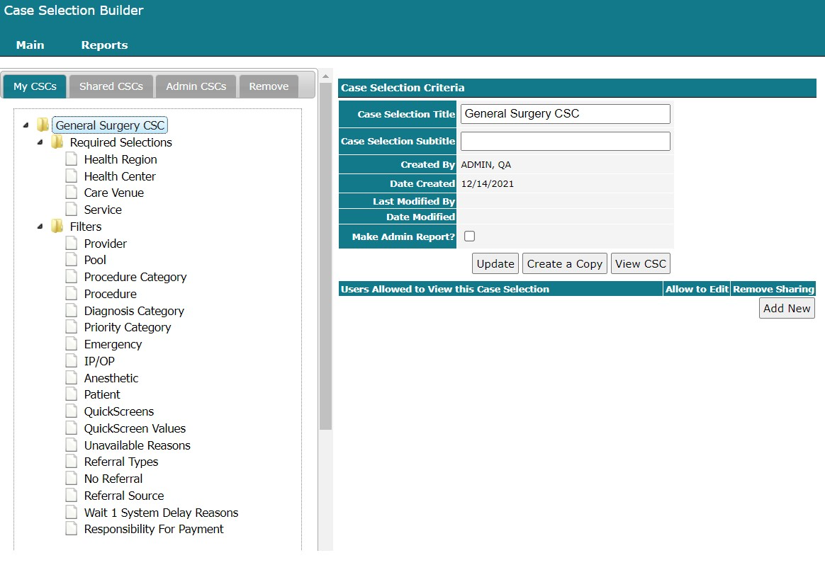 CSCs can be created, saved, and shared across the entire installation by administrators, or shared to individuals. By using the Case Selection Builder, users can create a library of CSCs which they can use to run specific report templates. For instance, they could create a CSC for the Main OR site to run those reports; they could create individual CSCs for individual services; or they could create CSCs for individual procedures or groups of procedures.