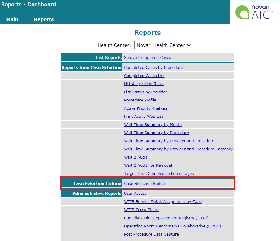 The Case Selection Builder allows you to build sophisticated case selection criteria (CSC) to be used with report templates. You can limit the data in any template to an intersection of service, provider, hospital site, priority, diagnosis, procedure, procedure category, or any other data field captured by Novari ATC (excluding custom fields).