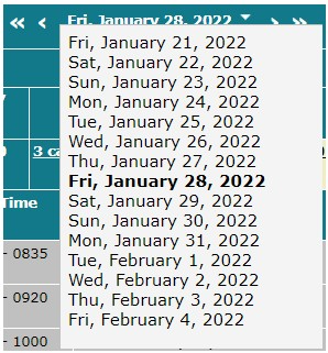 Hover your mouse pointer over the Down arrow to the right of the current date to open a list of dates from one week before to one week after the current date. Select a date from this list to jump directly to that day.