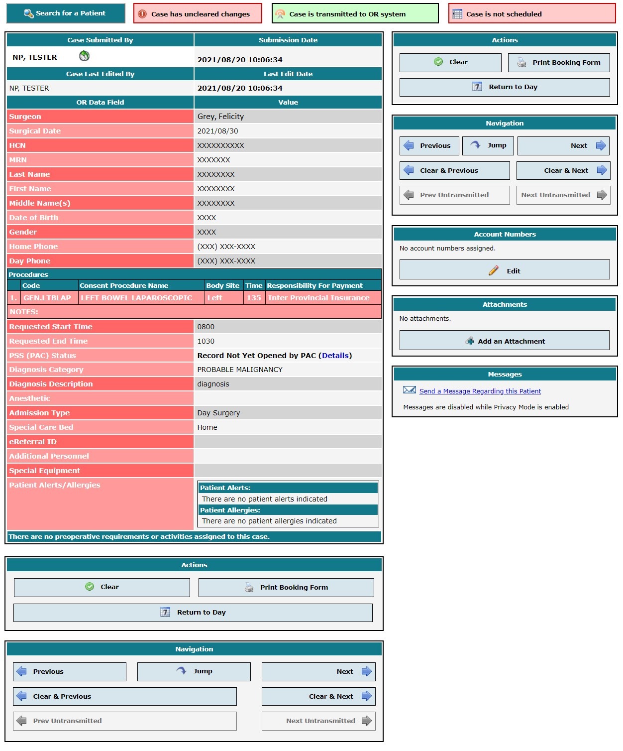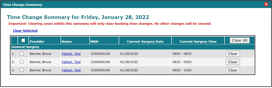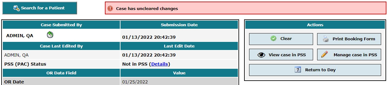 Clearance of a case (booking request) represents acknowledgement and acceptance of the booking details. Clearing a case marks that case as having been successfully transcribed in the OR system. In this fashion, once a case is cleared, Novari ATC can effectively flag to OR staff any future changes to the booking details.