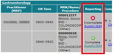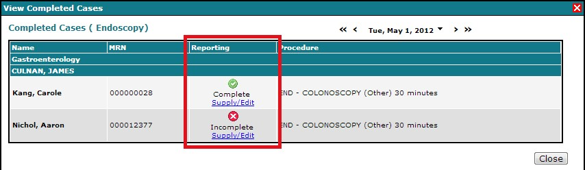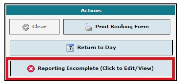 Reporting Incomplete button will open the appropriate reporting data entry screen. Post procedure data may also be captured from the case completion screen. You may complete post procedure data through the View Completed Cases dialog on the Booking Calendar.