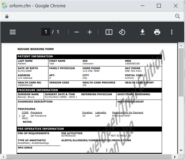 You can print the booking forms for a day, for a block, for changed cases or for one case, depending on where you are and what you need. When you choose to print the booking form (sometimes referred to in Care Venue module as ‘cases’), the booking form or forms appear as a PDF document in a dialog. You can download the PDF file or print it.