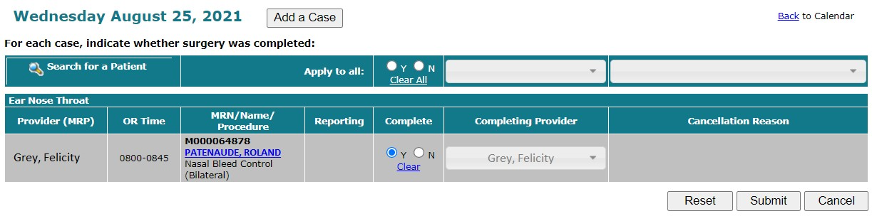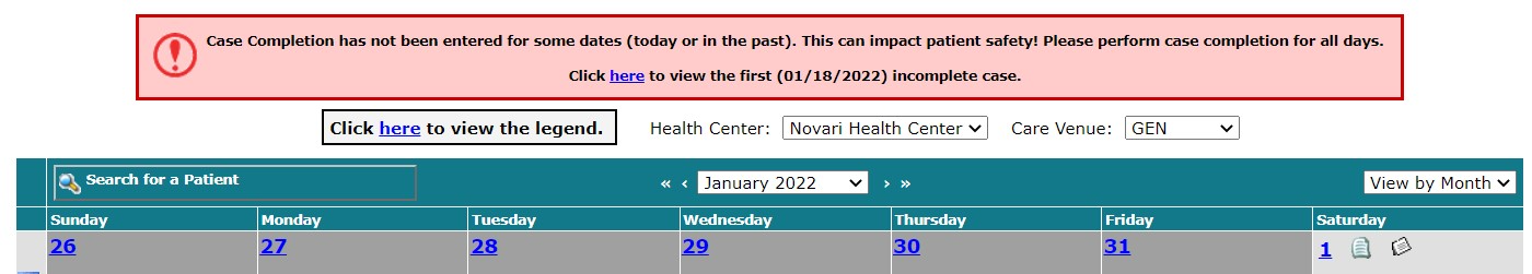 Select Case Completion Required on a day in the Booking Calendar to open the Case Completion page.