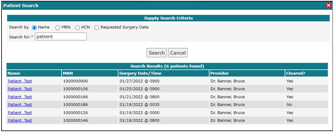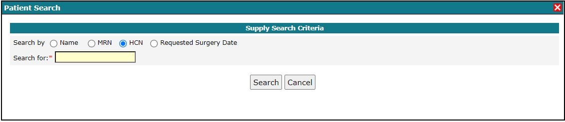 You can search for a patient by name, MRN, HCN or by the requested surgery date.