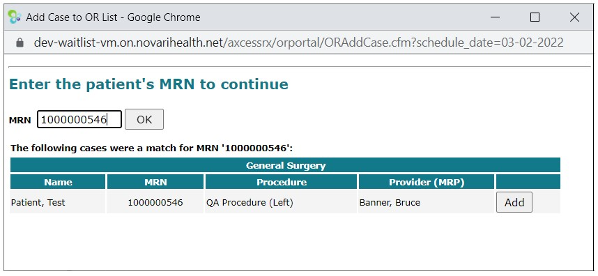 In the Add Case to OR List, enter the MRN and click OK.
