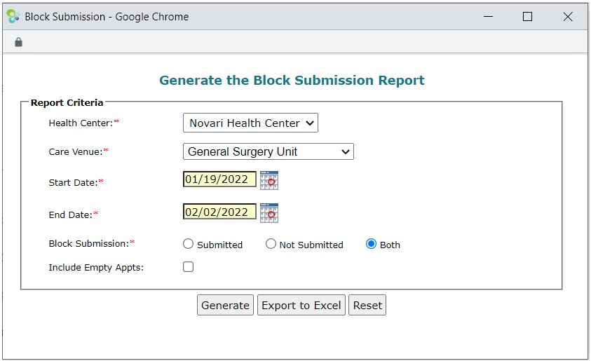 Select Block Submission Report from the Report item in the Care Venue navigation menu to open the Generate Block Submission Report dialog.