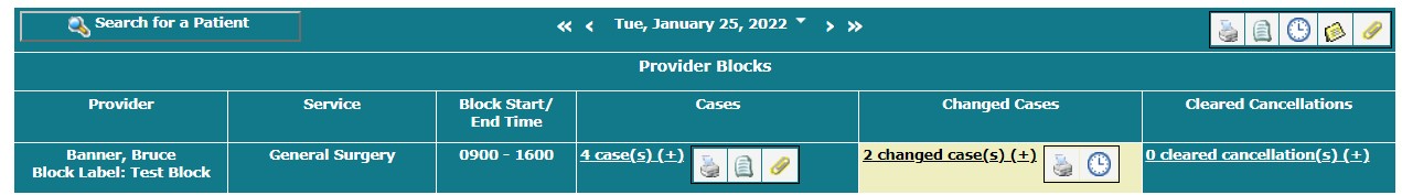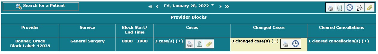 For each block on the Month View, the total number of scheduled cases for that service for that day and the total number of scheduled cases that have been changed.