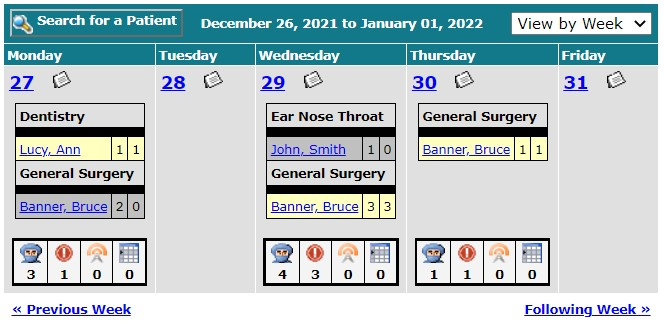 | Search for a patient by name, HCN, MRN or requested surgical date. | Month View, Week View, Day View |